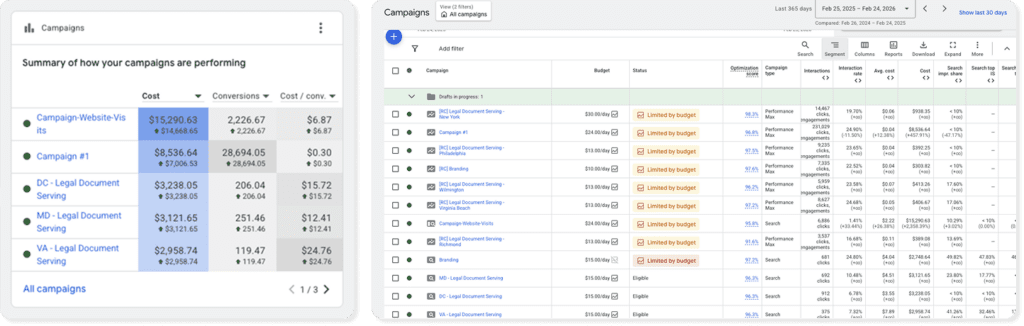 Capitol Process is a process serving company operating across DC, Maryland, Virginia, Philadelphia, New York, Wilmington, Virginia Beach, and Richmond. When they came to Ruskin Consulting, their Google Ads account had tracking issues, unfocused search terms, and campaigns that weren’t scaling efficiently.
